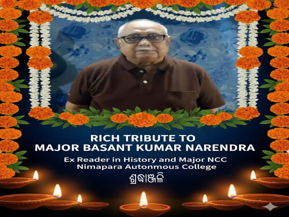 ନିମାପଡ଼ା, ( ଏ.ପି ନ୍ୟିୁଜ)  ଇତିହାସ ବିଭାଗର ପ୍ରଧ୍ୟାପକ ତଥା ନିମାପଡ଼ା କଲେଜର ପ୍ରାକ୍ତନ ଏନସିସି ବିଭାଗର ଅଫିସର ମେଜର ବସନ୍ତ କୁମାର ନରେନ୍ଦ୍ର  ୮୩ ବର୍ଷ ବୟସରେ  ତାଙ୍କ ଗୁହାଳପଡ଼ାସ୍ଥ ନିଜ ବାସଭବନରେ  ଦେହାନ୍ତ  ହୋଇଯାଇଛି। ସେ ଦୀର୍ଘଦିନଧରି ବାର୍ଦ୍ଧକ୍ୟ ଜନିତ ରୋଗରେ ପଡ଼ିତ ହୋଇ ଚିକିତ୍ସିତ ହେଉଥିଲେ। ଗତ ୧୫ ତାରି୍‌ଖ ରାତି ୧୦ଟାରେ ତାଙ୍କର ପ୍ରାଣ ବାୟୁ ଉଡ଼ିଯାଇ ଥିଲା। ତାଙ୍କ ମୃତ୍ୟୁଶର୍ଯ୍ୟା ନିକଟରେ ଏକମାତ୍ର ପୁତ୍ର ରାଜେଶକୁମାର ନରେନ୍ଦ୍ର ପୁତ୍ରବଧୂ ଉପସ୍ଥିତଥିଲେ।   ସ୍ବର୍ଗତ ନରେନ୍ଦ୍ର ସାର ନିମାପଡ଼ାର  ପୁରପଳ୍ଳୀରେ ନରେନ୍ଦ୍ର ସାର ଭାବେ ପରିଚିତ। ସେ ନିମାପଡ଼ା କଳେଜରେ ଇତିହାସ ବିଭାଗରେ ଯୋଗଦେଇ ପରବର୍ତ୍ତି ସମୟରେ ସେ କଲେଜ ଇତିହାସ ବିଭାଗର ମୁଖ୍ୟ ହୋଇଥିଲେ।ପରେ କସରଦା, ଗୋପ ଏବଂ କାକଟପୁର  କଲେଜର ଅଧ୍ୟକ୍ଷ ପଦରେ ରହି ଅବସର ଗ୍ରହଣ କରିଥିଲେ ଦେ କଟକ ଜିଲା ନିଆଳୀରେ ଅଳ୍ପଦିନପାଇଁ ଅଧ୍ୟକ୍ଷ ଦାୟିତ୍ବ ତୁଲାଇଥିଲେ।   ନିମାପଡ଼ା କଲେଜରେ ଚାକିରି ସମୟଭିତରେ  କଳେଜର,ଏନସିସି ଅଫିସରଭାବେ ନିଯୁକ୍ତିପାଇ ପରେ  ମେଜର ପଦକୁ ପଦ୍ନତି ମିଳିଥିଲା।      ସେ ଜଣେ  ଅମାୟି୍କ, ସରଳ ଛାତ୍ର ବତ୍ସଳ ଅଧ୍ୟାପକ ଥିଲେ। ସେ କଲେଜର ନାଟକରେ ଅଭିନ୍ୟ କରିଛନ୍ତି।  କଲେଜରେ ବିଭିନ୍ନ କାର୍ଯ୍ୟରେ ଛାତ୍ରମାନଙ୍କ ପଛରେ ଠିଆହୋଇଥାନ୍ତି। ସମସ୍ତ  ଛାତ୍ରସମାଜ ତାଙ୍କ ସହ ସାଙ୍ଗଭଳି ମିଳାମିଶା କରଥାନ୍ତି । ସାରଙ୍କ  ମୃତ୍ୟୁଖବର ପ୍ରଚାରିତ ହେବାପରେ ହଜାର ହଜାର ଛାତ୍ର ତାଙ୍କବାସଭବନରେ ପହଁଞ୍ଚି ଶେଷ ଦାର୍ଶନ କରି ଶ୍ରଦ୍ଧାଞଳି ଜଣାଇଥିଲେ। ତାଙ୍କର ହଜାର ଛାତ୍ର ରାଜ୍ୟର ବହୁ  ରାଜ୍ୟ ରାଜନୀତି, ବ୍ୟବସାୟୀ, ଶିଳ୍ପପତି ବଡ଼ବଡ଼ ପ୍ରଶାସନିକ ପଦ  ପଦବୀରେ ରହିଛନ୍ତି ,।ତାଙ୍କ ମୃତ୍ୟୁ କବର ମିଳିବାପରେଶିକ୍ଷାବିତ ମହଲରେ ଶୋକର ଛାୟା ଖେଳିଯାଇଛି।କଲେଜ ଏବଂ ଏନସିସି  ପକ୍ଷରୁ ସ୍ବର୍ଗତ ନରେନ୍ଦ୍ରସାରଙ୍କ ଅମର ଆତ୍ମାର ସଦଗତିପାଇଁ  ଶୋକ ସଭା ଅନୁଷ୍ଠିତ  ହୋଇଥିଲା । କଲେଜ ଅଧ୍ୟକ୍ଷ ଅମିତା ମହାନାୟକମଙ୍କ ଅଧ୍ୟକ୍ଷତାରେ ଅନୁଷ୍ଠିତ ଶୋକସଭାରେ ପ୍ରଶାସନିକ ଅଧିକାର ଡ଼ଃ ରବିନ୍ଦ୍ର ପାଢୀ,, ପୂର୍ବତନ ଅଧ୍ୟକ୍ଷ ଯୋଗେନ୍ଦ୍ର ଚନ୍ଦ୍ର ମିଶ୍ର ପ୍ରଦୀପ ଦାଶ୍ର ପ୍ରମୁଖ ‌ଶୋକ ବ୍ୟକ୍ତ କରିଛନ୍ତି