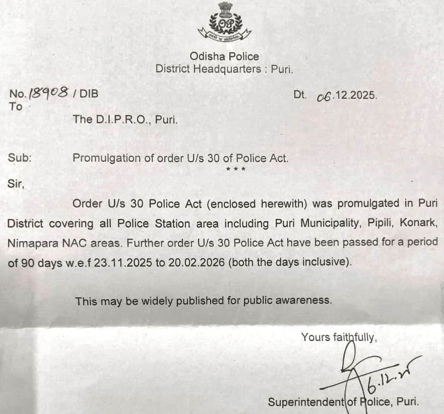 ପୁରୀ ୮/୧୨ (ଏ.ପି ନିୟୁଜ) ପୋଲିସ ଆଇନର ୩୦ ଧାରା ପୁରୀ ଜିଲ୍ଲାରେ ଲାଗୁ କରାଯାଇଛି।ଏହା ନଭେମ୍ବର ୨୩ ତାରିଖ ଠାରୁ ୨୦୨୬ ମସିହା ଫେବୃୟାରୀ ୨୦ ତାରିଖ ୯୦ ଦିନ ପର୍ଯ୍ୟନ୍ତ ପୁରୀ ଜିଲ୍ଲାର ସମସ୍ତ ପୋଲିସ ଷ୍ଟେସନ ଅଞ୍ଚଳ, ପୁରୀ ମୁନିସିପାଲ୍ଟି, ପିପିଲି, କୋଣାର୍କ ଓ ନିମାପଡା ଏନ ଏ ସି ଅଞ୍ଚଳରେ ବଳବତ୍ତର ରହିବ ବୋଲି ଏସପି ପ୍ରତୀକ ସିଂ ସୂଚନା ଦେଇଛନ୍ତି।